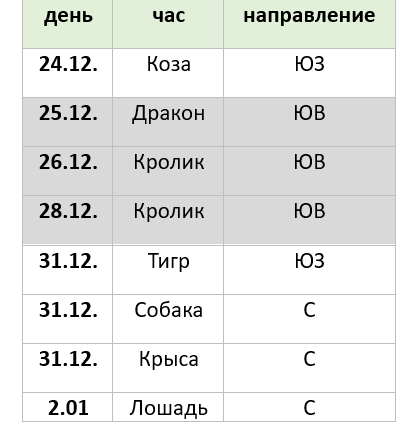 БЛАГОПРИЯТНЫЕ НАПРАВЛЕНИЯ- обозначены салатовым цветом